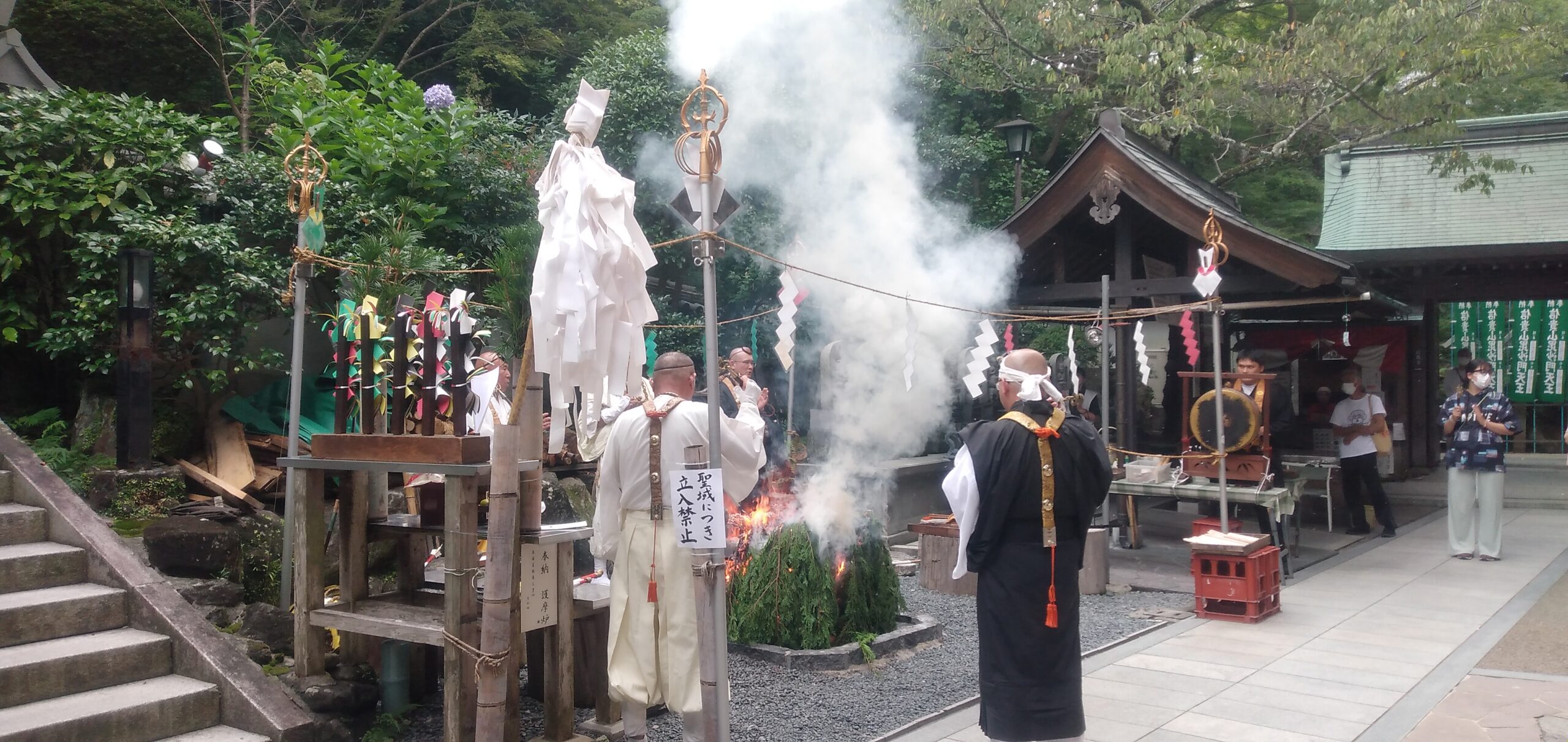 終わりにさしかかると、取り囲んでいる人々のなかから、悩みや願い事がある人は、用意された板に願い事と名前と数え年を書いてお坊さんに渡し、それを火にくべて燃やし、お坊さんが、お祈りをされます。
